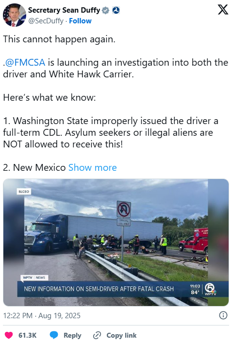 In a bold move amid mounting highway tragedies, U.S. Transportation Secretary Sean P. Duffy has launched a scathing investigation into “rogue states” accused of flouting federal rules on Commercial Driver’s Licenses (CDLs), directly linking lax enforcement to deadly crashes. The probe, announced on August 19, targets states like Washington, New Mexico, and California following a horrific Florida incident on August 12, where an illegal alien trucker – holding improperly issued CDLs – executed an illegal U-turn, killing three Americans. Duffy blasted “non-enforcement and radical immigration policies” for turning the trucking industry into a “lawless frontier,” allowing unqualified foreign drivers to operate massive 40-ton rigs.