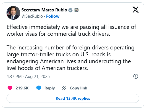 U.S. Secretary of State Marco Rubio is taking decisive action to address the non-domiciled commercial driver’s license (CDL) crisis, which has transformed America’s highways into both a public safety nightmare and a national security threat. Countless Americans have lost their lives this year at the hands of non-English-speaking migrants/illegal aliens operating 80,000-pound big rigs – yet they should never have been on the road, but were allowed to because rogue sanctuary states handed out CDLs like candy. Under the Biden-Harris regime, tens of thousands of these migrants flooded into the trucking industry, many unable to read road signs in English.