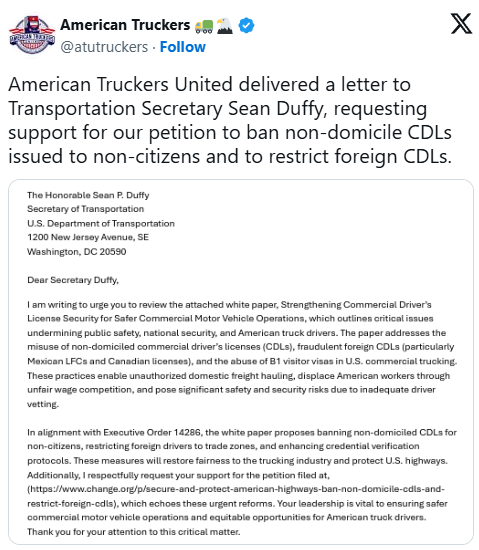 American Truckers United has sent an urgent letter to Transportation Secretary Sean P. Duffy, demanding a ban on non-domicile Commercial Driver’s Licenses (CDLs) for non-citizens and restrictions on foreign CDLs to commercial trade zones.